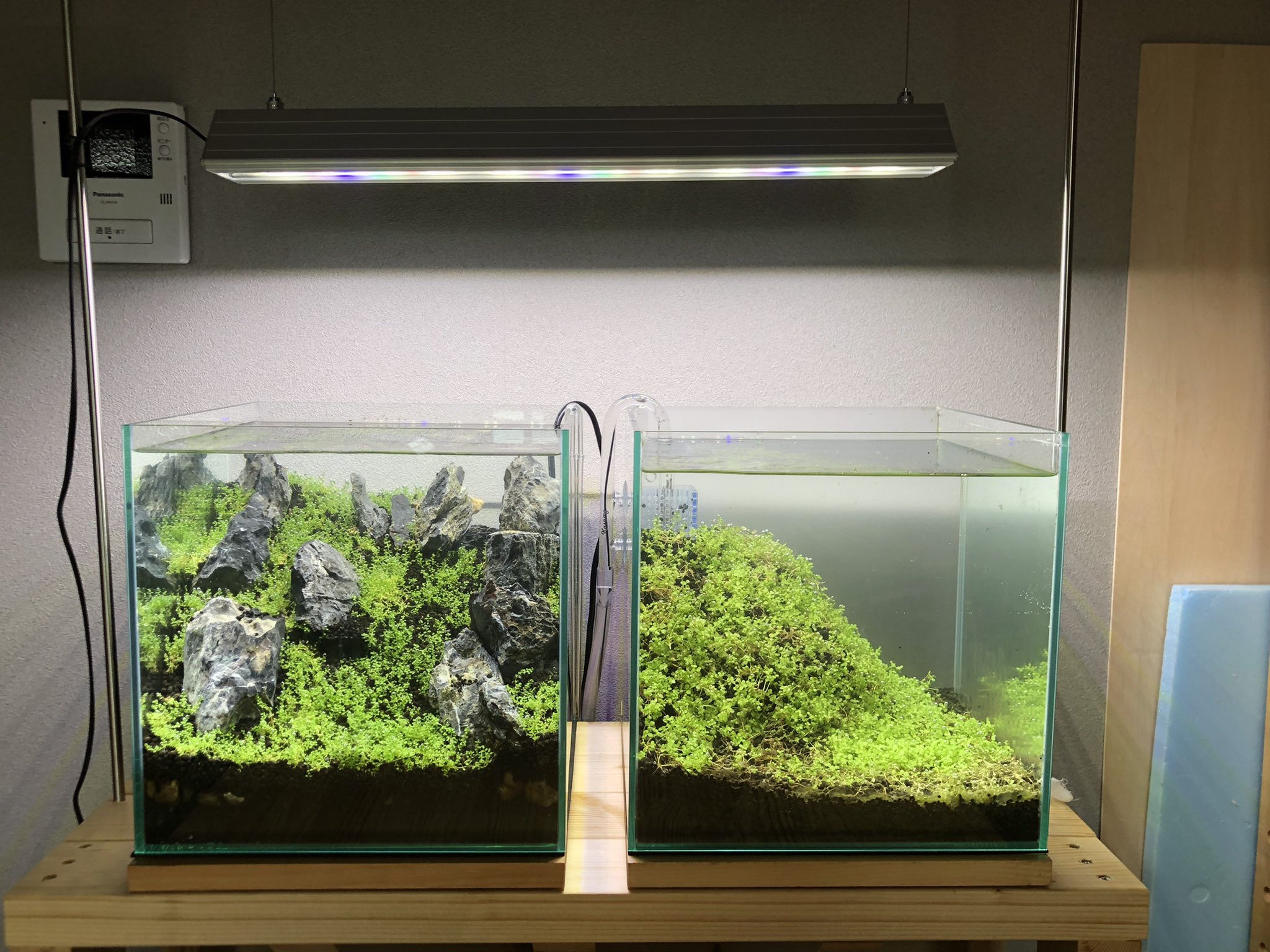 水草くさお 30cmキューブたち キューバパールグラスとニューラージパールグラス 注水完了 ミスト式って言っても やっぱり注水するとソイルが雪崩れてしまった ともあれ Co2の分岐も出来たしやっとこれで水景眺めれる T Co Dh4fbghb0s